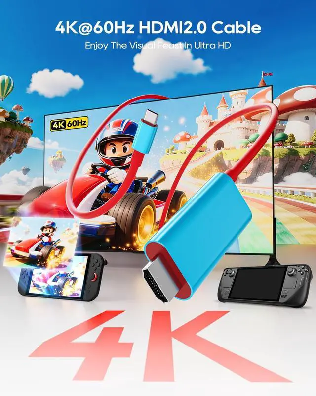 Whether you need a reliable Steam Deck charger or a Switch 2 charger, this kit has you coveredready to use right out of the box. ^^ 4K/60Hz Ultra HD Output with Advanced HDMI Adapter TechnologyElevate your visual experience with this high-performance HDMI adapter. Supporting 4K@60Hz video, 5.1 surround sound, and 18Gbps bandwidth, it ensures smooth, real-time transmission without lag. The integrated smart chip enhances color and clarity for vibrant, distortion-free images on any compatible display.