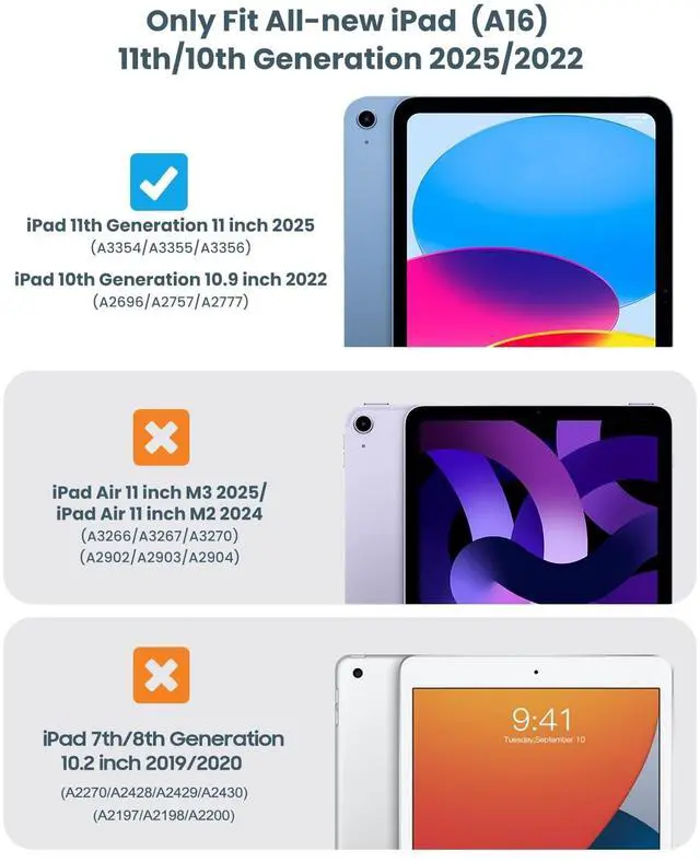 Compatibility: Preciously designed for iPad (A16) 11th generation 11 inch 2025 (Model: A3354 A3355 A3356), iPad 10th generation 10.9 inch 2022 (Model: A2696 A2757 A2777 A3162). Please check the back bottom of your ipad to find the model number ^^