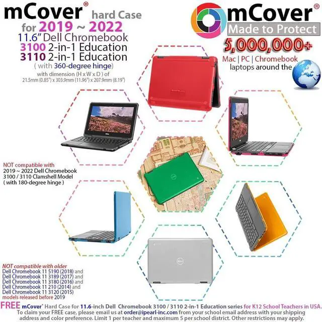 NOTE: Before placing order, PLEASE make sure to verify your laptop model number as this case is MODEL specific and NOT interchangeable. ^^ NOT fitting other 11.6 -inch Dell laptops. NOT compatible with ANY other laptops as well. ^^ Made of high-quality translucent polycarbonate material which is shatter-proof and will protect your 2019~2022 11.6" Dell Chromebook 3100 / 3110 2-in-1 Education series ( with 360 hinge) Laptop Computers all around ^^ Designed to perfectly fit the 2019~2022 11.6" Dell Chromebook 3100 / 3110 2-in-1 Education series ( with 360 hinge) Laptop Computers with dimension of 11.96 x 8.19 x 0.85 inch ( 303.9 x 207.9 x 21.5 mm ) ^^ 2-piece light-weight ( 8.7 oz or 246 g ) shell easily snaps on and off.