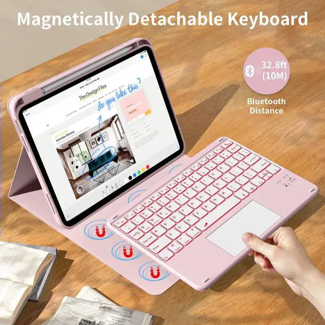 Slim Wireless Bluetooth KeyboardThe slim (6.2mm) removable keyboard is attached to this iPad cover with keyboard magnetically (supporting Windows, IOS & Android System), let your ipad instantly become a portable laptop, perfect for working, typing, editing or watching videos, greatly improved your iPad productivity.