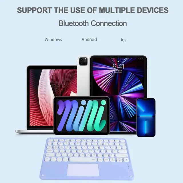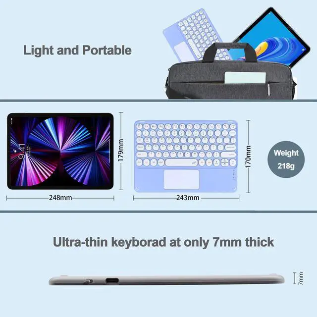 COMPACT KEYBORADThe ultra-thin and lightweight keyboard is very slim, only 7mm thick with a lightweight design. The wireless keyboard with touchpad is easy to use for traveling or business trips, and users can carry it with them or easily put it in their bag in a compact and portable size. It measures 24.2 x 17 x 0.7 cm ( 9.57 x 6.69 x 0.27 inches) and weighs only 218 grams ( 7.69 ounces). ^^ BLUETOOTH CONNECTIONThe bluetooth keyboard easily establishes a Bluetooth connection with compatible devices. It automatically recognizes and connects to each recognized device and works up to 10 meters away.
