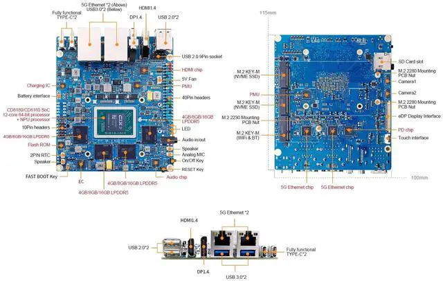 It supports multiple mainstream AI models and meets the application needs of generative AI in diverse edge scenarios, such as chatbots and AI-assisted programming. At the same time, relying on its graphics acceleration algorithm and graphics engine, it can support desktop 3D graphics applications such as games and industrial design software. ^^ Rich Ports - OrangePi 6 Plus 32GB has a rich set of interfaces, including USB 3.0, USB 2.0, HDMI, 5G Ethernet, MIPI camera interface, TF slot, Type-C port power supply, 40Pin expansion connector, and fan connector, etc.