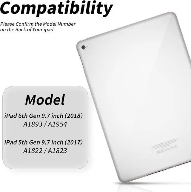 Compatibility ModelThis iPad case with keyboard is designed for 9.7 inch iPad 6th Gen 2018 (A1893/A1954), iPad 5th Gen 2017 (A1822/A1823), iPad Air 2 (A1566/A1567) and iPad Air (A1474/A1475/A1476). NOT compatible with any other iPad models. Please check the back bottom of your iPad to find the model number before placing order. ^^ Slim Wireless Bluetooth KeyboardThe slim ( 6.2 mm) removable keyboard is attached to this iPad 6th generation case with keyboard magnetically (supporting Windows, IOS & Android System), let your iPad instantly become a portable laptop, perfect for working, typing, editing or watching videos, greatly improved your iPad productivity.