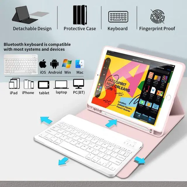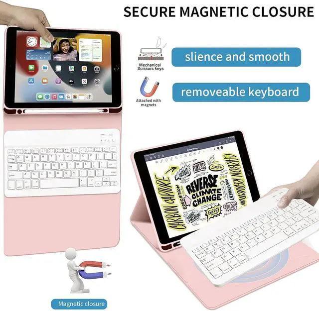 • Slim Wireless Bluetooth KeyboardThe slim (6.2mm) removable keyboard is attached to this iPad 6th generation case with keyboard magnetically (supporting Windows, IOS & Android System), let your iPad instantly become a portable laptop, perfect for working, typing, editing or watching videos, greatly improved your iPad productivity.