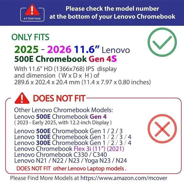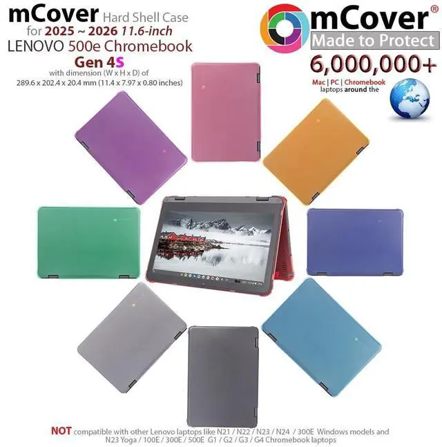 NOTE: Before placing order, PLEASE make sure to verify your laptop model number as this case is MODEL specific and NOT interchangeable. ^^ NOT Compatible for other 11.6 -inch or 12-inch or 13-inch or 15-inch Lenovo Chromebook laptops. NOT compatible for ANY other Lenovo laptops as well. ^^ Made of high-quality translucent polycarbonate material which is shatter-proof and will protect your 2025 or later 11.6" Lenovo 500e Chromebook Gen 4s 2-in-1 Laptop against scratches and accidental damages ^^ Designed to perfectly fit the 2025 or later 11.6" Lenovo 500e Chromebook Gen 4s 2-in-1 Laptop with dimension of 289.6 x 202.4 x 20.4 mm ( 11.4 x 7.97 x 0.80 inches) ^^ 2-piece light-weight ( 7.0 oz or 198 g ) shell easily snaps on and off.