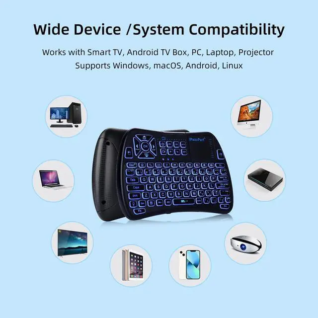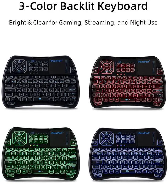 Replace multiple remotes with one compact keyboard and keep your living room clutter-free ^^ 3-Color Adjustable Backlight Switch between red, green, and blue backlight modes. Type or navigate easily even in the dark. Great for late-night streaming, gaming, or presentations without disturbing others ^^ Rechargeable Battery Built-in lithium battery, USB rechargeable, no more frequent battery replacements. Save money and the environment