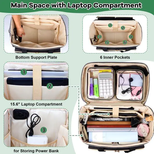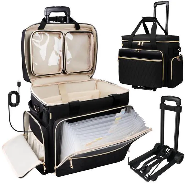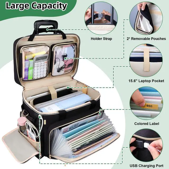 Detachable Trolley with Elastic RopesThis rolling briefcase for women features a foldable trolley with a telescopic handle adjustable to 3 heights ( 17.1 /28/ 37.4 inches) to suit different heights. Detachable bungee cords and 2 silent wheels enhance stability. ^^ Accordion File Area& USB Charging PortThe teacher bag with wheels for women features an accordion file organizer pocket to storage letter-size documents (test papers, notebooks, folders, etc. ). The rolling work bag for teaching supplies comes with a USB charging port, cable, and an internal pocket for a power bank, so you never have to worry about your electronics running out of power on the travel.