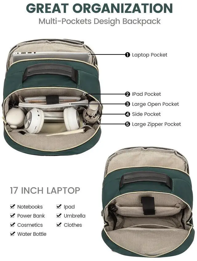 LARGE CAPACITYThis backpack purse looks delicate & stylish, but can hold everything you need on the go. The travel backpack has multiple compartments to hold the laptops, iPads, phones, charger, binders, bottles, umbrellas, magazines, clothes, pens, wallets, and more. ^^ MULTI-COMPARTMENTS & POCKETSThis women's business work backpack is designed with 4 compartments and 17 pockets. Ample pockets keep your travel items organized. ^^ LAPTOP PROTECTIONThe laptop backpack is designed with 15.6 -inch laptop separate compartments and a 11-inch iPad slot; with cushioned cotton sewn around, it maximizes physical protection of your electronic devices.