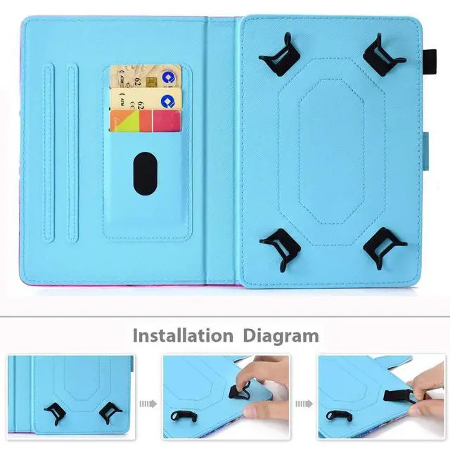 Inch Tablet Compatibility: This case is designed for all around 9.5" - 10.5" tablet, such as 9.7 inch Apple iPad series, iPad Pro 10.5, Samsung Galaxy 9.7 inch series, Kindle Fire HD 10 (2015/2017), Dragon Touch, Chromo Inc, ProntoTec, NeuTab, Nextbook, Tagital, Alldaymall, iRulu, RCA, iView Android tablet etc. ( No camera opening; NOT support auto sleep / wake for any tablets )Features: 1) Soft Synthetic PU leather tablet cover gives full protection and easy installation. 2) Convenient Card Solts Holder wallet style, manage your ID / credit cards / business cards on the go. 3) Equipped with 4 flexible clasps, easily clip-on and protect your device from scratches, dust and splashing water. 4) Stand feature, prop up the tablet safely and hands free reading or watching videos. 5) Powerful magnet folio case, keeps the front cover sealed and open or shut flexibly. 6) Lightweight cover with comfortable grip and many fun colors for option. Ideal for home, work and travel.