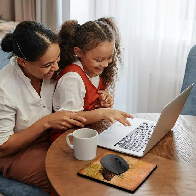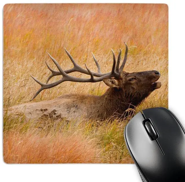 Elk, cervus elephus, resting in Meadow Grass. Mouse pad is 8" x 8" x 25" and is made of heavy-duty recycled rubber. Matte finish image will not fade or peel. Machine washable using a mild detergent and air dry.