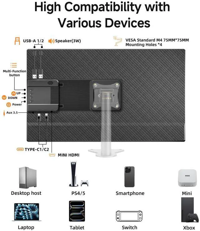 Portable Gaming Monitor 2.5K QHD resolution and amazing 180 Hz refresh rate give you the edge in all your gaming quests; Equipped with FreeSync technology and HDR function to eliminate image tearing and stuttering for higher motion clarity and smoother gameplay ^^ 23.8" IPS Big ScreenOur revolutionary 23.8" 1080P portable monitor delivers desktop-grade performance in a sleek, go-anywhere design. Transform any space into your perfect workstation - effortlessly multitask, create, or immerse in entertainment. The ultimate fusion of size and portability for modern pros. ^^ VESA-Compatible & Adjustable KickstandThe VESA-compatible and 90adjustable kickstand features an integrated design, making this travel monitor for laptop a convenient travel companion for laptops, gaming consoles, and phones.