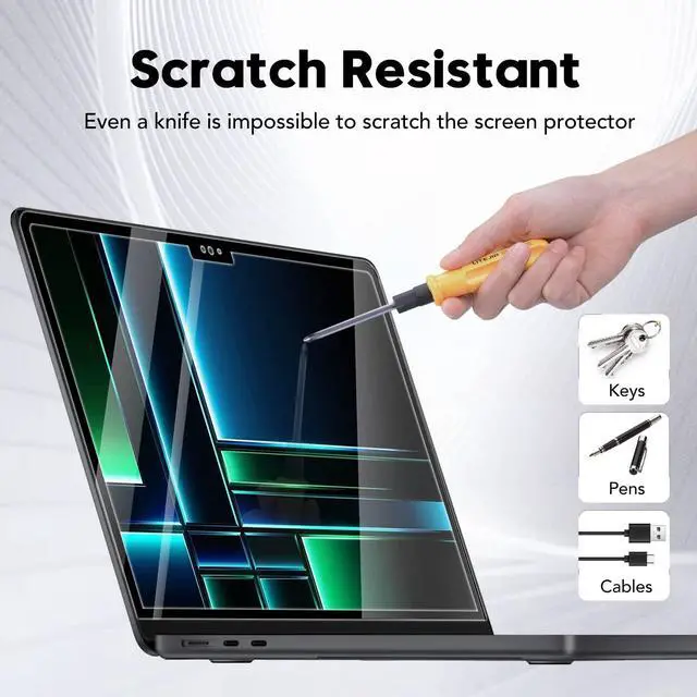 Scratch Resistance: 9H Hardness Mac Pro 16.2" M2 Pro 2023 Tempered Glass Screen Protector protects your for MacBook from accidental bumps, and also can effectively protect your Laptop from scratches by some hard objects (eg: keys, screwdrivers, pens, cards, knives). Hydrophobic and oleo-phobic coating to reduce skin oil, sweat and fingerprints left on the screen ^^