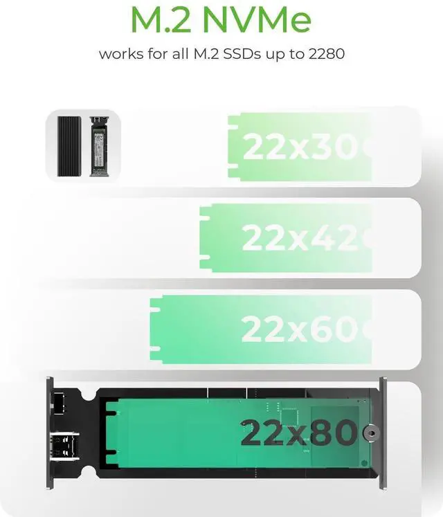 Perfect for quick swaps or on-the-go use, these enclosures prioritize convenience without compromising durability. ^^ Broad CompatibilitySeamlessly connect across devices and platforms. Supports M. 2 NVMe PCIe SSDs (M-Key, B+M Key) in sizes 2230/2242/2260/2280. Compatible with Windows, macOS, Linux, Android, and iOS, ensuring plug-and-play functionality without drivers. ^^ Portable and Durable DesignCrafted for mobility, these enclosures feature compact, lightweight aluminum builds. Ideal for travel, they fit easily into pockets or bags, combining portability with robust construction for reliable data storage on the move.