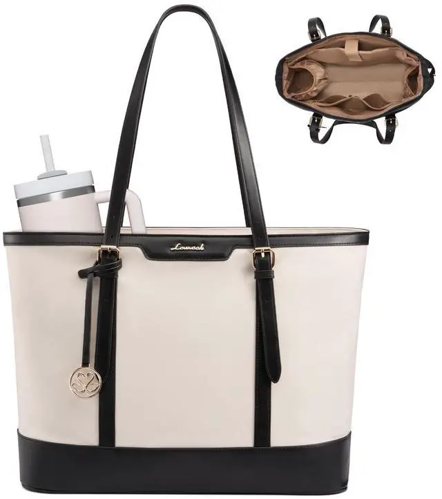 LOVEVOOK Work Tote Bag for Women 15.6 Inch Laptop Computer Bags with Cup Holder, Large Teacher Bag Briefcase for Business Office Travel Black-White, Nylon&PU