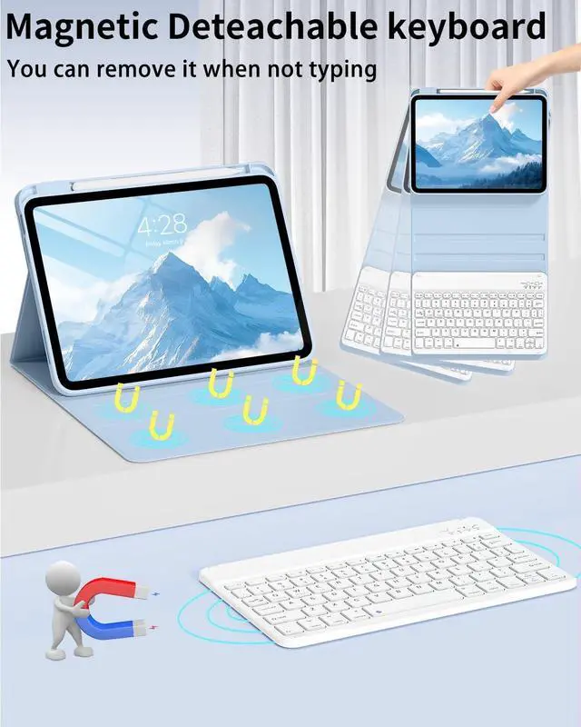 Detachable Bluetooth KeyboardDetachable Bluetooth keyboard with magnetic case, instantly becomes a portable laptop, easy to install and remove, built-in rechargeable battery, no need to replace the battery, Type-C charging cable It can be fully charged in 2 hours, work for at least 230 hours, stand by for 90 days, making it more convenient to use