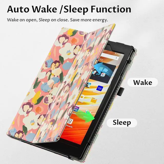• [Auto Wake/Sleep]: Kindle Fire HD 10 case automatically wakes your Fire HD 10 tablet when opened and puts it to sleep when closed. And the magnetic closure and elastic band keep the cover securely closed, protecting your device from dropping out