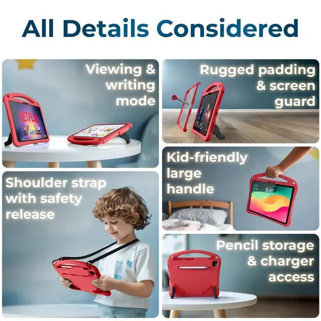 Considered: iPad Air 11 inch case kids with extra stable dual-angle stand for kids to read, study, watch videos, play games, draw, paint; child-friendly oversized handle; pencil storage; charger access ^^