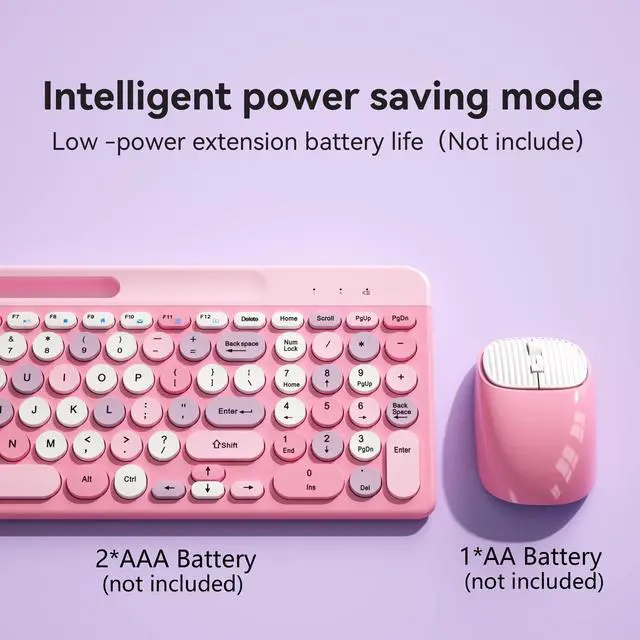Plug & Play 2.4G Wireless ConnectionOne 2.4 GHz USB receiver can connect both the keyboard and mouse, can also be used separately, plug & play, no need to download any software. 2.4 GHz wireless provides a powerful and reliable connection up to 33 feet (10m) without any delays. (Wireless USB receiver is at the bottom of the mouse). No Delay, No Dropout. ^^ Power Saving Extends Battery LifeAfter 10 minutes of inactivity, the wireless keyboard mouse combo will automatically go into sleep mode to save energy. The keyboard requires two AAA battery, and the mouse requires one AA.