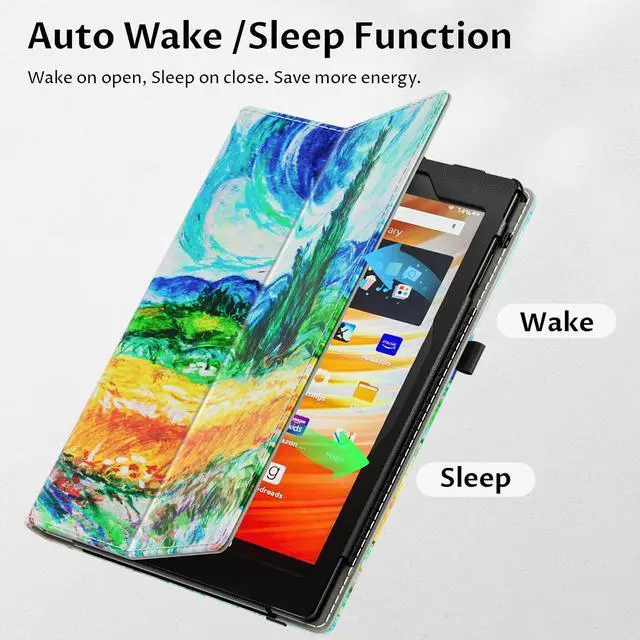 Wake/Sleep]: Kindle Fire HD 10 case automatically wakes your Fire HD 10 tablet when opened and puts it to sleep when closed. And the magnetic closure and elastic band keep the cover securely closed, protecting your device from dropping out ^^ [Strong