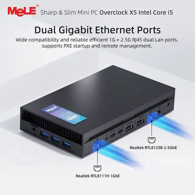 Further storage expansion is enabled through an M. 2 2280 SATA interface supporting up to 2TB additional capacity. This powerhouse enables seamless multitasking and rapid data access. ^^ Quad Display & Versatile Connectivity- Measuring just 18010331mm ( 0.57L ), the MeLE Overclock X5 packs quad 4K display outputs into its compact chassis. Engineered for professionals, it boasts dual HDMI 2.0, dual USB-C 10Gbps, dual USB-A 10Gbps, dual 3.5 mm audio jacks, a Micro SDXC card reader, and dual Ethernet ports (1GbE + 2.5G bE). This ultra-compact powerhouse delivers professional-grade expansion for multi-screen office setups, digital signage, surveillance systems, and beyond.