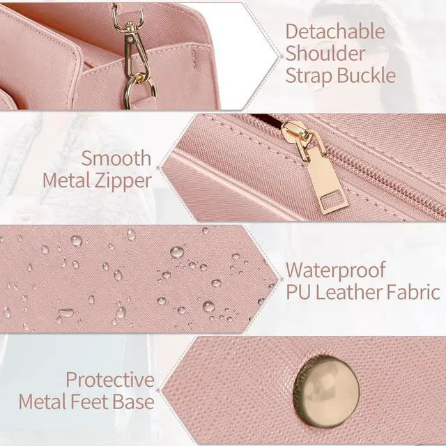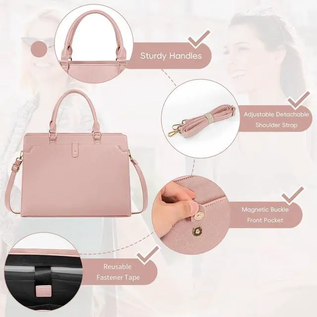 The main compartment features a thick padded sleeve with anti-collision foam and a secure velcro strap at the top to keep your device in place, providing all-around protection during commutes or travel. Perfectly sized to carry your laptop, tablet, and all daily essentials with ease and style ^^ PREMIUM MATERIAL & WATERPROOFThe briefcase for women is crafted from premium soft PU leather, the waterproof PU leather material protects the device from spills and makes cleaning easy and convenient. The sturdy gold hardware makes the PU bag more stylish and durable; the smooth top zipper closure design ensures that your belongings are safe and secure; the bag is also equipped with metal foot pads at the bottom to protect your briefcase from scratches ^^ REMOVABLE & ADJUSTABLE SHOULDER STRAPReinforced Adjustable Straps design offers two carry ways, can be used as a tote or a shoulder bag.