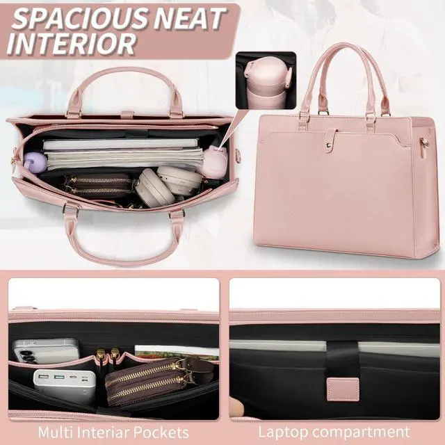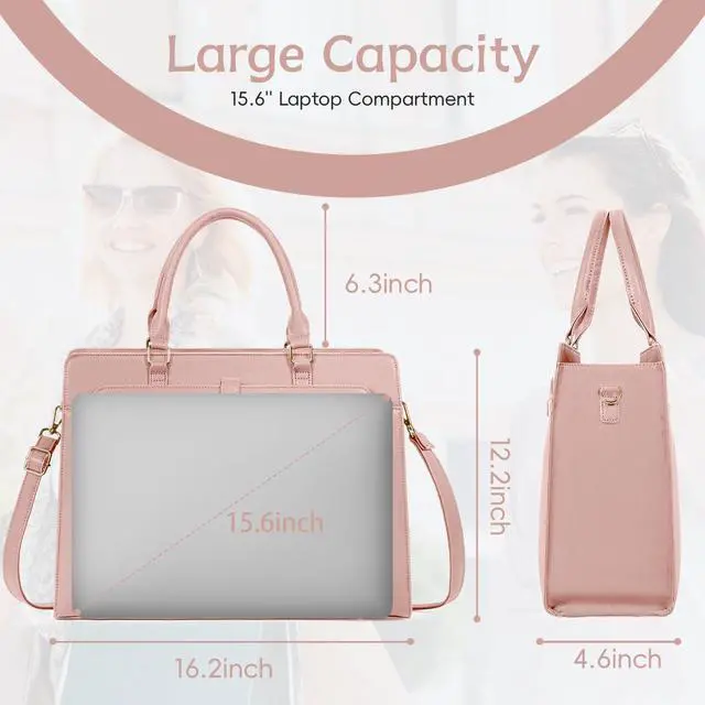 LARGE CAPACITY & MULTI-POCKET DESIGNThis leather womens laptop bag features a spacious main compartment with a padded laptop sleeve ( 15.4" 7.9" ) that securely fits and protects your MacBook or other 15.6 -inch laptops. Includes 2 side slip pockets, 2 pen holders, 2 small accessory pockets, and 2 interior zipper pockets to keep your essentials organized. Dedicated side pockets and slots provide convenient storage for an umbrella, water bottle, pens, and other office supplies ^^ 15.6" LAPTOP SECURITY PROTECTIONThis stylish, spacious laptop bag for women is designed to fit 15.6 '' and smaller laptops.