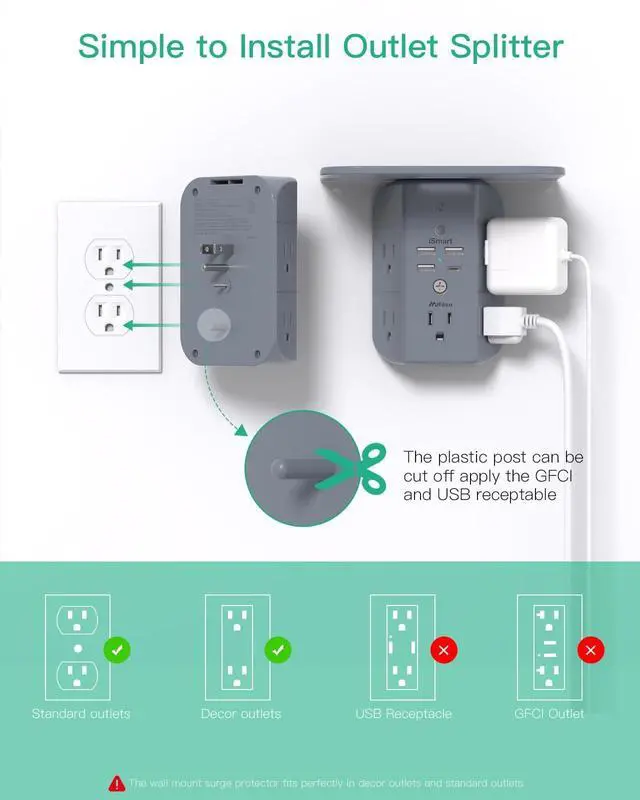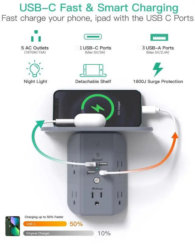 9 IN 1 Wall Outlet ExtenderOutlet Extenders are designed with 5 USB outlets + 3 USB ports + 1 USB-C port. The 3-sided power strip with LED night light, and Detachable Shelf. With the removeable screw and the plastic prong, the multi plug outlet is firmly attach to your DUPLEX and DECOR outlets, and perfect for bedroom, dorm room etc. ^^ Outlet Extender With Soft Smart Night LightLED light power is 1.5W. This product has a built-in light sensor that automatically turns on the night light when ambient lighting is low.