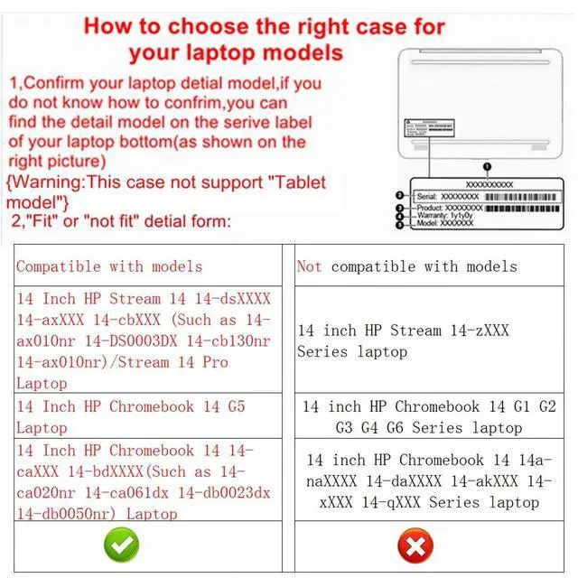 ^^ Warning: NOT compatible with 14 inch HP Chromebook 14 14-naXXXX 14-daXXXX 14-akXXX 14-xXXX 14-qXXX Series Laptop and HP Chromebook 14 G1 G2 G3 G4 G6 Series Laptop and HP Chromebook x360 14 14c-caXXXX Series Laptop and HP Stream 14-zXXX Series laptop and HP other Pavilion/ENVY/Spectre/EliteBook series laptop and other brands laptop {{Warning: Most of returned because of choosing wrong model, please confrim your laptop model}}. ^^ This protective cover is made of the high-quality PU leather, characterized by the beautiful appearance and fine hand feeling; the inner-layer soft cashmere can better protect the laptop. ^^ Unique design with two elastic rubber bands could solve the problem of loose cover effectively in the process of using laptop (This case not support "Tablet model"). ^^ Unique liner design for laptop cooling, this case do not affect the heat dissipation of the laptop. Our store have 500+ laptop models cases, search more laptop models's case, please search "Alapmk + your laptop model".