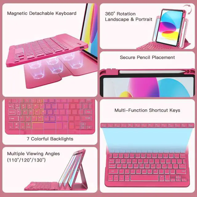 Colors: The magnetic detachable keyboard with 7-color backlight & 3-level brightness adjustment enjoy comfortable typing in any lighting condition. Featuring a row of shortcut keys for instant control, volume and brightness perfect companion for home, office, or travel.