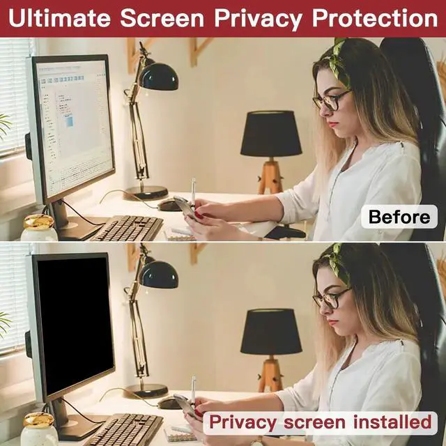 ^^ Two Attachment OptionsOur computer privacy screen 22 inch can use 2 installation options complete installation quickly, perfect fit with no bubbles. Option 1 you can apply clear adhesive strips directly on the monitor privacy screen filter to securely attach to any computer monitor screen; Option 2 (for computer screens with a raised bezel only) use slide mount tabs that easily stick to the display frame, allowing you to slide the privacy screen filter on and off as needed. ^^ Anti Scratch & Keep Screen CleanEngineered with scratch-resistant PET material, this computer monitor privacy screen 22 inch acts as a durable shield against daily wear, preventing scuffs and marks from pens, cleaners, or accidental contact. Its nano-coated fingerprint-proof surface repels oils and smudges simply wipe away dust or fingerprints with a soft cloth to maintain pristine screen clarity. Beyond privacy, it actively protects your monitors original screen from scratches while keeping both sides (glossy/matte) looking brand-new for years. Perfect for busy workspaces or homes with kids/pets, it combines triple defense privacy, anti-glare, and physical protection. ^^ Package Contents Each package includes 22 inch computer monitor privacy screen filter x2, clear adhesive strips set x2, slide mounting tabs x4, oversized microfiber cleaning cloth x1.
