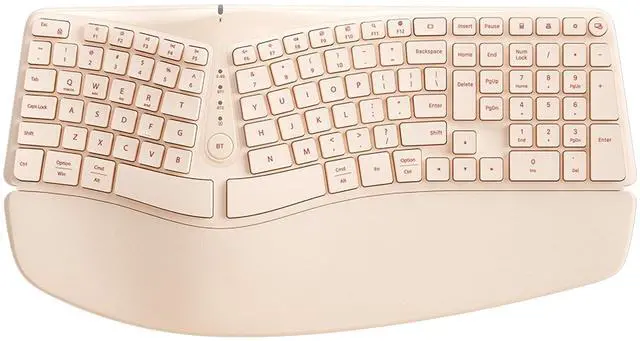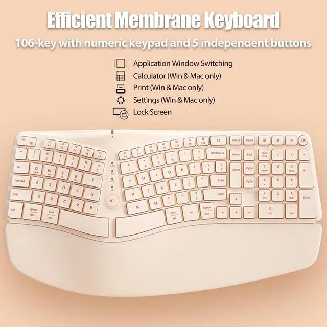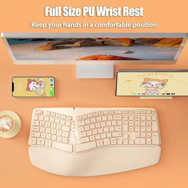[Arc-Shaped Split Keys Ergonomic Keyboard] - This ergonomic wireless keyboard features an arc-shaped split key layout, delivering a natural input experience that improves typing posture. The tilted arched design can effectively reduce muscle fatigue in the wrists and forearms, keep the hands and shoulders relaxed, and prevent tenosynovitis. ^^ [Ergo Keyboard with Full Size PU Wrist Rest] - This ergonomic keyboard is equipped with a full-size wrist rest made of comfortable PU leather material, providing wrist-conforming support to help keep your hands in a comfortable position. The innovative design of front and rear keyboard feet allows it to offer a total of 4 typing angles, enabling your wrists to maintain a natural and comfortable posture whether you use it in a sitting or standing position.