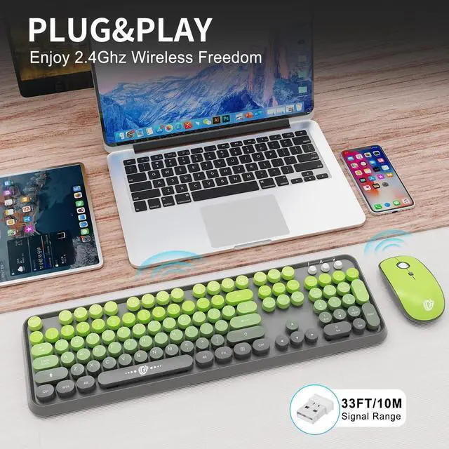 The compact USB receiver is plug-and-play. The wireless keyboard mouse combo connects instantly upon startup. The signal coverage is wide (about 10 meters). Say goodbye to tangled wires and interface limitations. Whether you are handling documents at work, browsing the web, you can enjoy flexible, efficient, and intuitive operation experiences. ^^ Colorful Keyboard - Light up Your Personalized DesktopThis wireless keyboard offers multiple stylish and bright color options. The quiet keyboard and mouse wireless adopt coordinated color schemes or contrasting designs, with an elegant and lively or simple and sophisticated appearance.