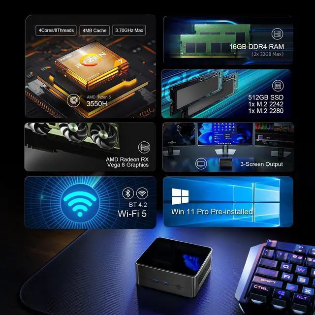 Powerful Ryzen 5 Mini PC Up to 50% Faster PerformanceExperience desktop-grade power in a compact body with the AMD Ryzen 5 3550H mini PC (4 cores, 8 threads, up to 3.7GH z Turbo). Compared to entry-level N150 or N100 mini PCs, this Ryzen 5 mini computer delivers up to 50% faster multi-core performance. The integrated Radeon Vega 8 Graphics provides superior iGPU power for smooth 4K video streaming, 3D modeling, and multitaskingideal for office, business, and home use ^^ Expandable Memory & Storage Upgrade AnytimeThis mini desktop PC includes 16GB DDR4 RAM and a 512GB NVMe SSD for fast boot and file access.