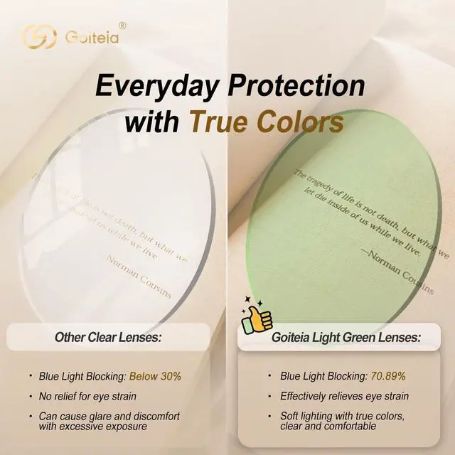 Low Color Distortion: Goiteia light green tinted lenses are engineered to block blue light without color distortion, providing a true-to-life visual experience. Unlike standard blue light lenses that can cause color shifts, dizziness, and fatigue, these are perfect for everyday users seeking a natural view while watching videos or browsing images. ^^