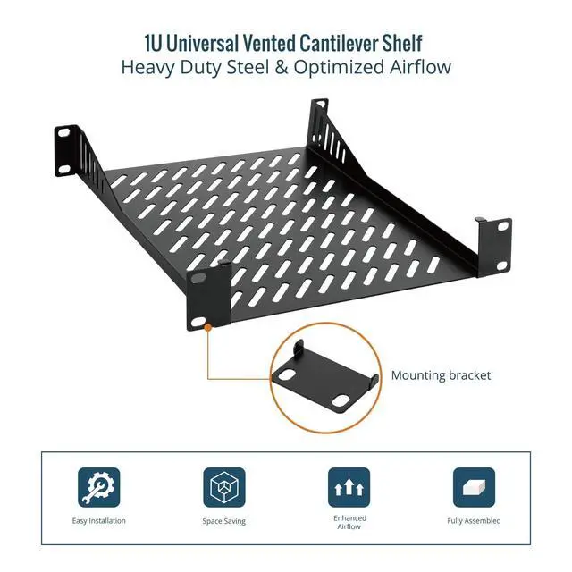 Quick & Easy Installation: Includes all necessary mounting hardware (1U 10-inch cantilever shelf, 8 x 10-32 screws, 4 x 10-32 cage nuts, 2 x mounting brackets) for fast, hassle-free setup