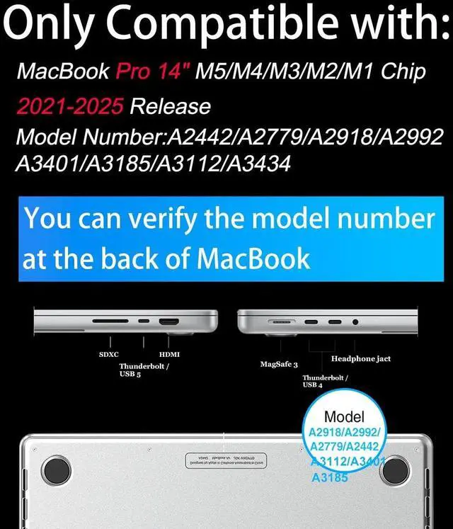 CASE FOR MACBOOK PRO 14 INCH - Only Compatible with MacBook Pro 14 inch M5 M4 M3 M2 M1 2021 2023 2024 2025 Release with Liquid Retina Display & Touch ID, Model: A2918, A2992, A2779, A2442, A3112, A3401, A3185, A3434. ^^ WARNING - NOT Compatible with MacBook Pro 13 15 16 inch and MacBook Air. ^^ EASY INSTALLATION AND PERFECT FIT- two-piece snap on design for easy installation and removal. Allows your MacBook Pro 14" to open more than 90 degrees and precise cutouts allow full access to all functions, fontrols, and Buttons. Plug your charger, cable, or headset without removing the case. ^^ DURABLE MATERIAL- M5 M4 M3 M2 M1 MacBook Pro 14 Case is made of high-quality plastic materials, replacing your computer to withstand everyday fingerprints, scrapes, and scratches. ^^ 5IN1 BUNDLE - Including 1 MacBook Pro 14" Case (including top and bottom cover), 1 matching Keyboard Cover, 1 Screen Protector 1 Dust Plug, 1 USB Adapter. Give your computer full protection.