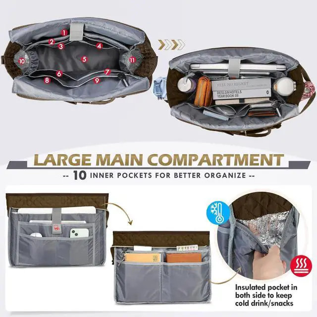LARGE CAPACITY & MULTIPLE STORAGE- The large main compartment of this teacher laptop bag with 10 inner pockets could easily hold all your daily necessities/college supplies/teaching materials/medical supplies in an organized way. The padded laptop compartment of this teacher tote bag offers optimal protection, which can fit in a 15.6" laptop and a 12.9" iPad. Insulated pockets on both sides are designed for snacks or coffee storage and keep cold or warm for hours ^^ MULTIPLE ORGANIZER POCKETS- Teacher Work Bag Size: 16.54"L x 5.91"