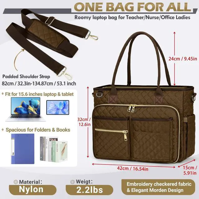 W x 12.6"H; weight: 2.2 lbs. Double layers of the front organized compartment aim to store scattered items. The front zip compartment features 4 elastic loops, one open pocket, and one mesh pocket, it's easy to stay organized with all of the different pockets. The 3 open pockets and a zip pocket in front offer easy access for items on hand. It also features a paper pocket in the back ^^ LONG LASTING MATERIALS- Made of durable water & scratch resistant polyester fabric, with smooth golden zippers, sturdy handle, and adjustable padded shoulder straps, nurse work bag prefect combination of stylish and functional. Reinforced stitching at each stress point ensures the laptop briefcase durability for long-term performance. High quality quilted teacher laptop tote bag aims to provide a sturdy and reliant user experience ^^ CONVENIENCE DESIGN FOR TRAVELERS- The luggage strap in the back allows this women tote bag to slide over the luggage tube, to free your hand on the go. The standard size of this women laptop bag makes this a good airplane travel bag, it is able to fit in the overhead bin and under seat space.