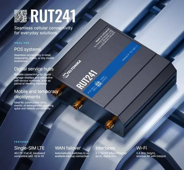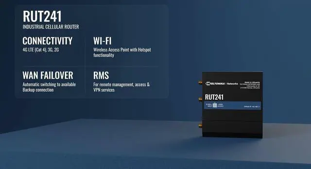 Reliable 4G LTE Connectivity Stay connected with high-speed LTE Cat 4 for fast and stable internet access, ensuring seamless communication for industrial, IoT, and remote applications. ^^ Dual Ethernet & Wireless Support Features one LAN and one WAN Ethernet port along with a 2.4GH z WiFi hotspot, making it perfect for flexible networking solutions. ^^ Remote Management System (RMS) Compatible Easily monitor, configure, and update devices remotely using Teltonika's RMS platform for hassle-free network management. ^^ Advanced Security & VPN Features Secure your network with built-in firewall, OpenVPN, IPsec, PPTP, and WireGuard VPN support, ensuring encrypted and protected communication.