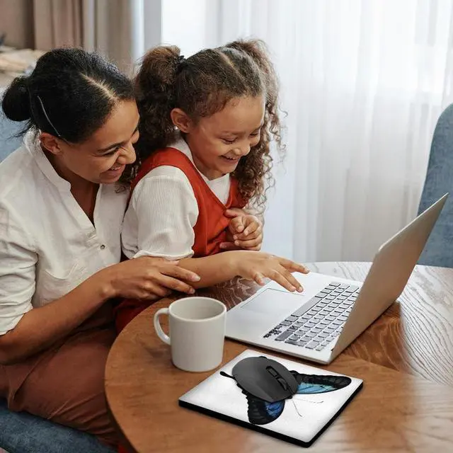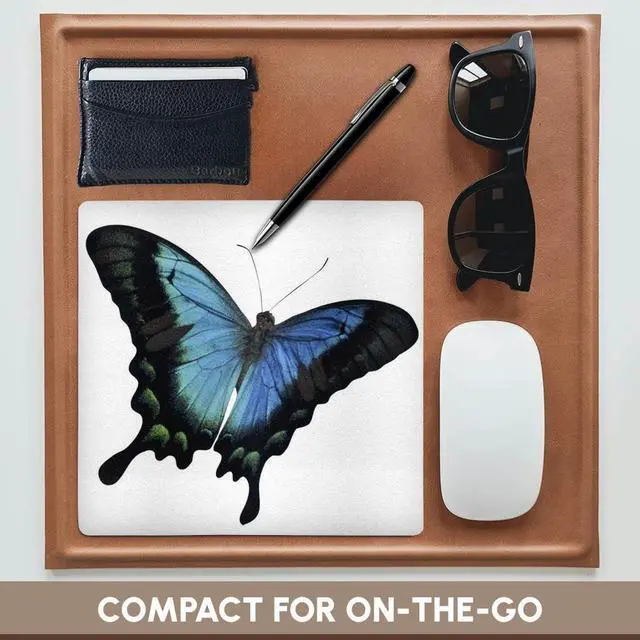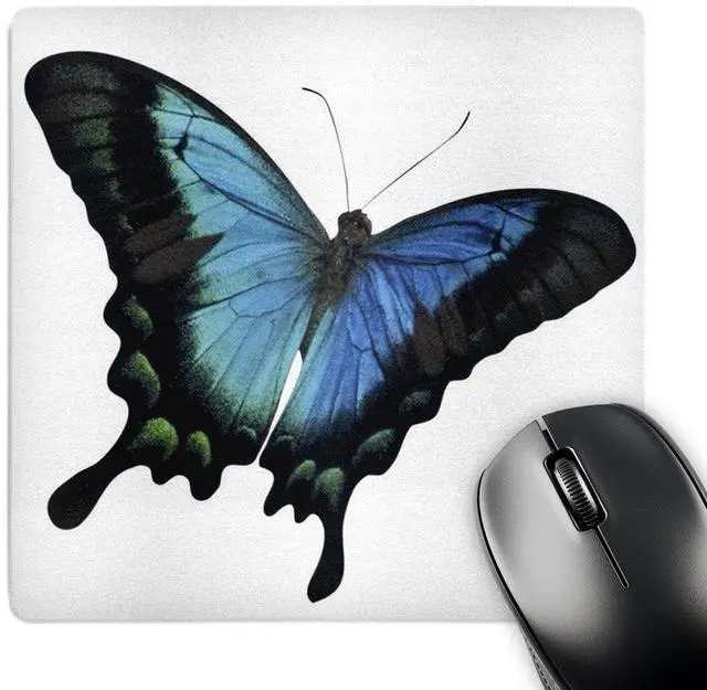 Blue and Aqua Butterfly Mouse Pad is 8" x 8" x. 25" and is made of heavy-duty recycled rubber. Matte finish image will not fade or peel. Machine washable using a mild detergent and air dry.