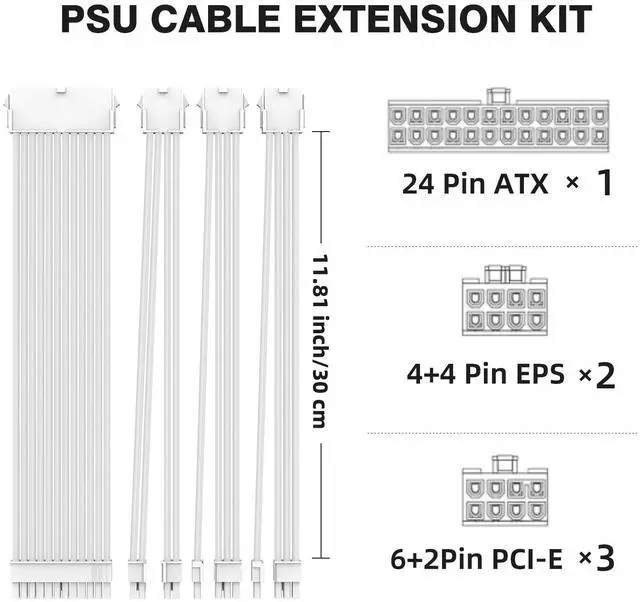 The kit includes: 1x24 PIN ATX Extension Cable (For Motherboard), 2x4+4 PIN EPS Cable (For CPU), 3x 8to 6+2 PIN PCI-E Cable (For GPU) ^^ 16AWG CABLESOur PSU extension cable uses 16AWG copper wire, which significantly increases the copper content, reduces resistance and power consumption, and solves the problem of power line heating caused by the use of high-power products ^^ CABLE COMBSThe set of white connector housing provides 4 pure white cable combs for each cable. The set of black connector housing provides 8 cable combs (4 clear+4 black) for each cable ^^ MULTIPLE COLORSSMEOZZ offers a variety of colors for you to choose from, allowing you to freely DIY your computer case and make it stand out from the crowd ^^ SALES SERVICEIf you have any questions or problems in your shopping, please contact us. Our team will provide you with the good service