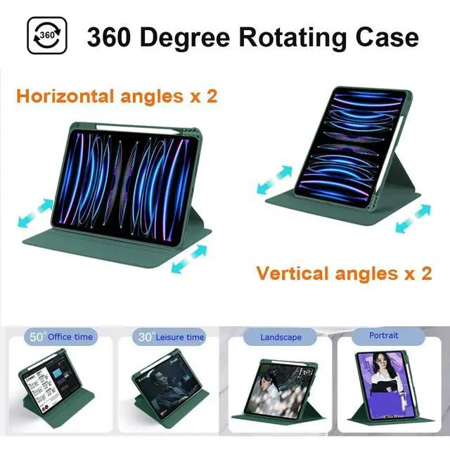 • 360Rotate Case: 360 degree rotating structure provides flexible landscape mode and portrait mode stand. Four adjustable angles meet your needs of watching videos, wirting, typing, drawing, video calls, etc