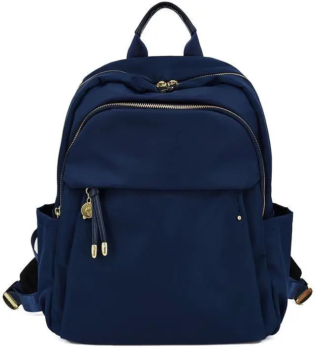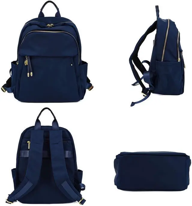 Durable Water-Resistant Nylon BackpackThe M-ioi-M womens backpack is crafted from high-density nylon thats lightweight, scratch-resistant, water-repellent, and easy to clean. Smooth metal zippers with thicker pullers and a faux-leather wrapped handle ensure both durability and style. ^^ Stylish & Versatile DesignWith gold-tone hardware, a decorative front plate, and faux-leather zipper accents, the M-ioi-M travel backpack blends minimalist elegance with modern fashion. Its timeless look makes it perfect as a work bag, school daypack, or casual rucksack for everyday use. ^^