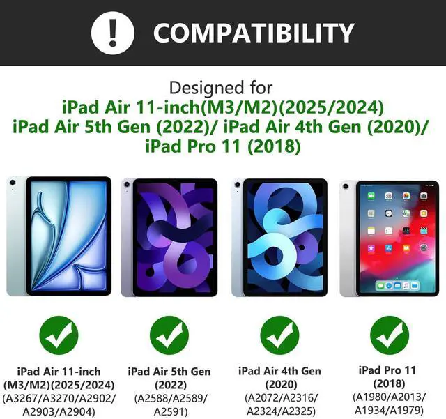 Gen: Designed for iPad Air 11-inch (M3) 2025 (A3267/A3270), for iPad Air 11-inch (M2) 2024 (A2902/A2903/A2904), for iPad Air 5th generation 2022(A2588/A2589/A2591), for iPad Air 4th generation 2020 (A2072/A2316/A2324/A2325), for iPad Pro 11 1st Gen 2018 (A1980/A2013/A1934/A1979). Please carefully check the model number on the back of your tablet ^^ Detachable Wireless Keyboard for iPad