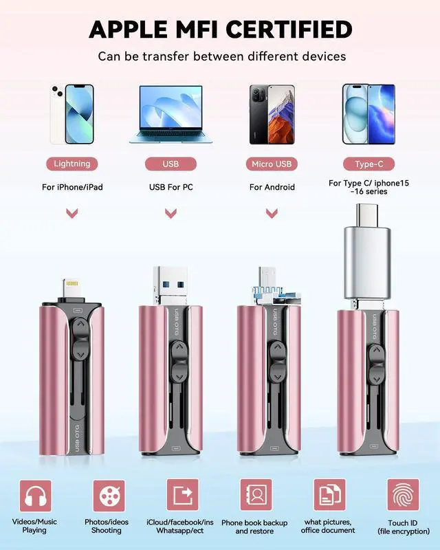 ^^ Fast Data Transfer: This thumb drive supports iOS devices with iOS 12.1 or later, OTG Android phones, computers, and other devices with USB ports, offering broad compatibility. It quickly transfers data, making it easy to store your photos, videos, and music. Whether for large files, high-resolution images, or HD videos, it gets the job done quickly. Easily share data with friends and colleagues using the photo storage, making work and play more fun. ^^