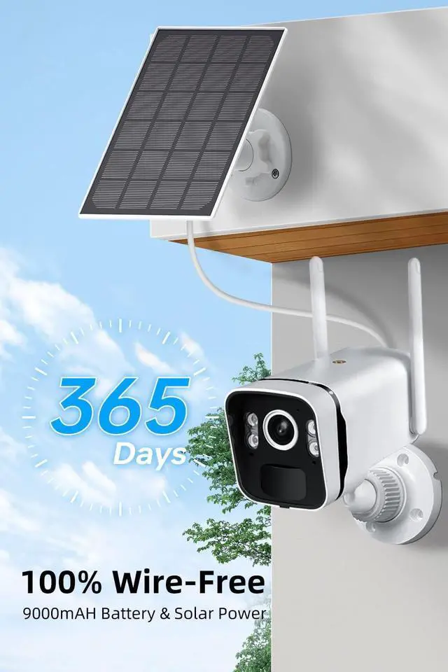 Real Wire-Free & Solar Power Real wireless security camera system, wireless cctv camera is powered by solar battery NO need to plug in. wireless camera built with 9000Mah battery, Environmenttal friendly and provide non stop 24/7 surveillance. IP66 waterproof, Suit for outdoor and all weather use.