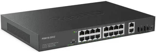 Poe switch with 802.3af/at compliant16-Ports 10/100/1000 switch with 2*Gigabit RJ45 Ports and 2 SFP ports, providing up to 30W per port and total PoE power budget of 300W. The 2 uplink ports can be connected to different networks or devices, such as routers, NVRs