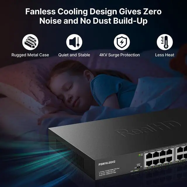 Unmanaged Plug and PlayEasy setup with no software installation or configuration needed, support power detection function, automatically detects devices, will not burn non-standard PoE devices or standard PoE switch