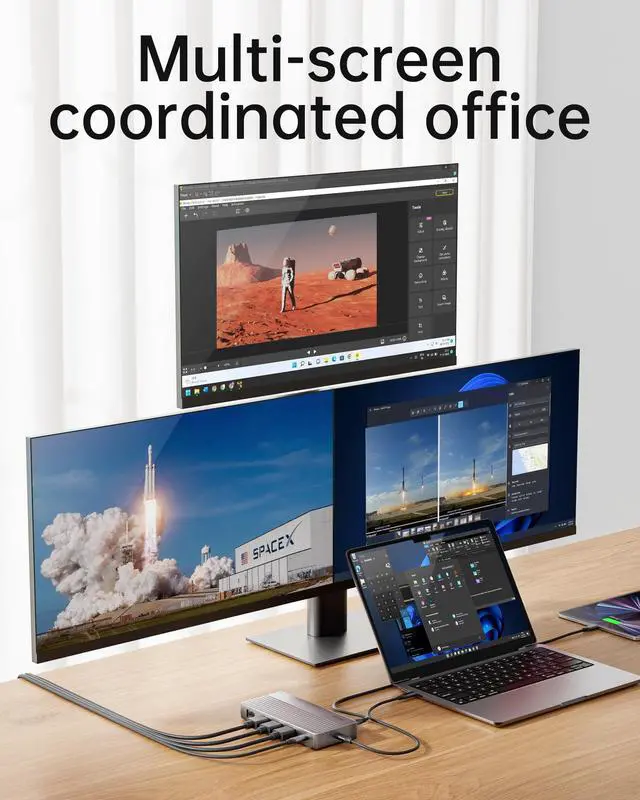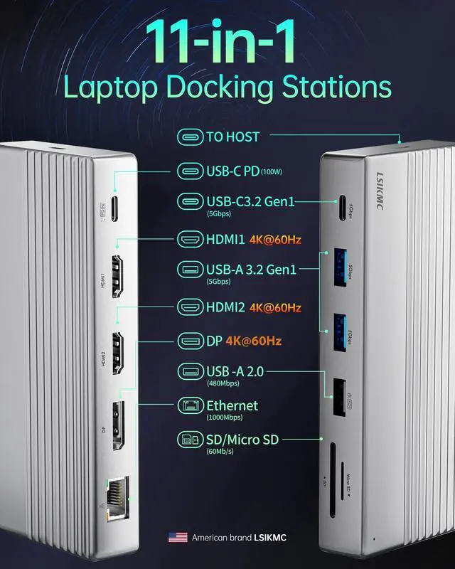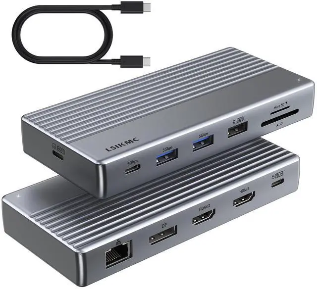 Comprehensive Port Expansion This USB C Docking Station (11-in-1) enhances connectivity with one USB-C data port, dual HDMI, one DisplayPort, three USB-A 3.0 ports, Gigabit Ethernet, and SD/TF card slots. It functions as a versatile dock station for USB-C laptops, tablets, and peripherals. ^^ Multi-Display Flexibility As a docking station dual monitor (or triple-screen via MST/SST on Windows), it supports up to three 4K@60Hz displays.