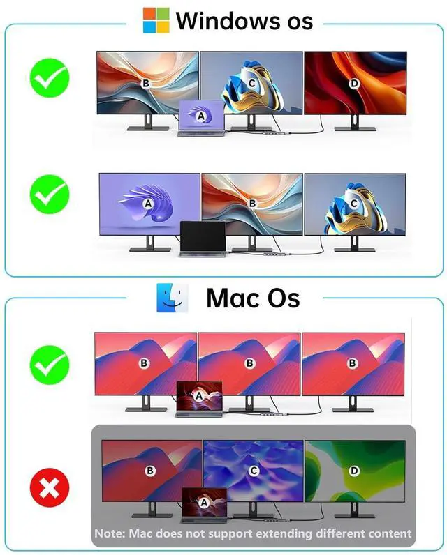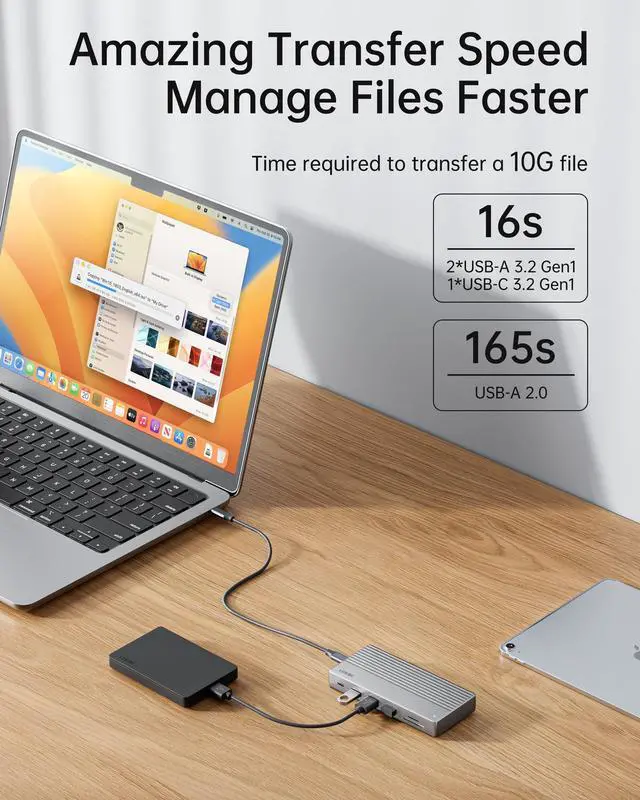 Note: Only single-screen extended display on macOS. This docking station 3 monitors optimizes multitasking efficiency. ^^ High-Efficiency Power Delivery The host port delivers up to 87W charging for compatible laptops (e. g., MacBook/Dell), while the PD port provides 100W external power to stabilize full-load operation of this usb c docking station dual hdmi, ensuring uninterrupted usage. ^^ High-Speed Data Transfer Transfer files at 5Gbps (approx. 540MB/s) via USB 3.0 or USB-C data ports. The front USB-C port is data-only (no video output), ideal for external storage in this usbc docking station. ^^ Stable Wired Network Connectivity The built-in Gigabit Ethernet in this dual monitor docking station offers reliable browsing and streaming for USB-C devices, reducing dependency on wireless networks. ^^ After-Sales Assurance Backed by an 18-month warranty (free replacement for manufacturing defects) and 24/7 technical support for your laptop docking station.